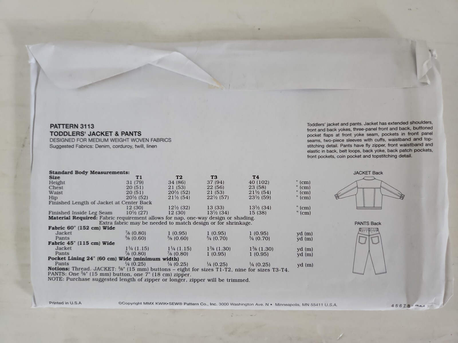 Kwik Sew 3113 Baby Toddler Jacket Pants Pattern Sz T1 T4 Denim Jeans Girl Boy For Sale Online Ebay